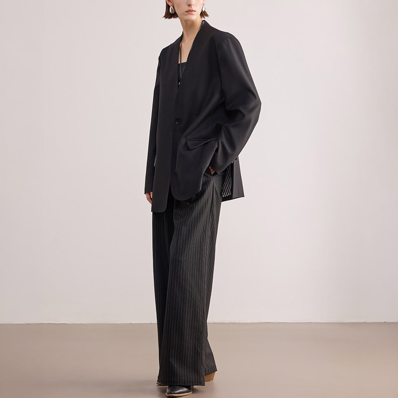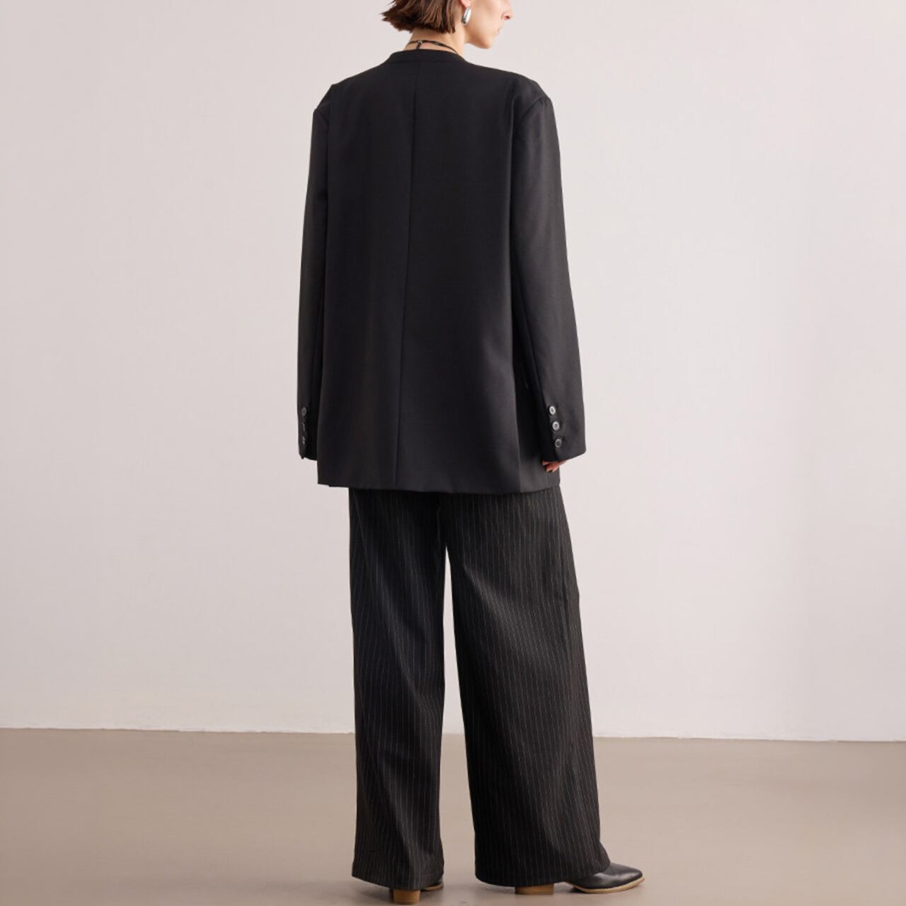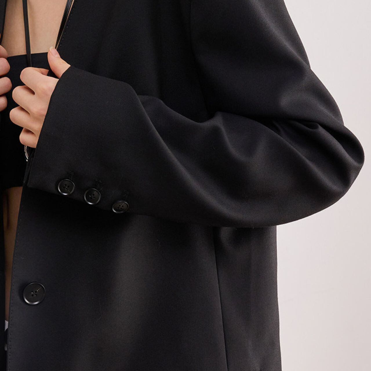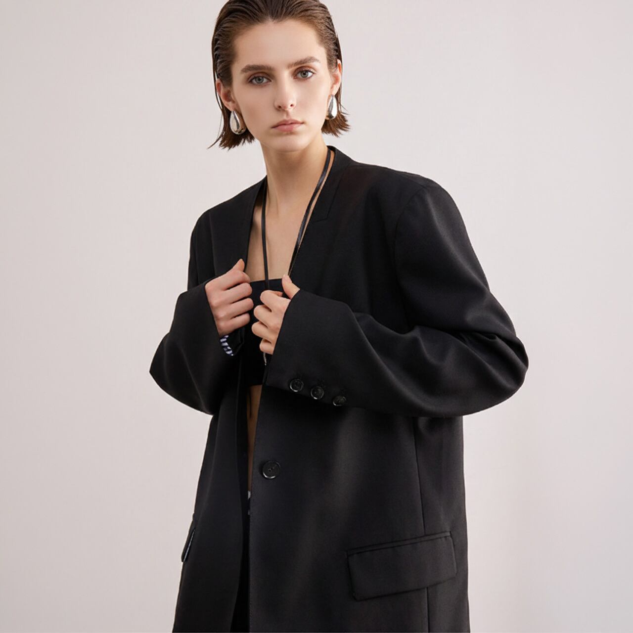 ■Size(cm) S:肩幅44, 胸囲114, 袖丈60, 着丈71 M:肩幅45, 胸囲118, 袖丈60.5, 着丈72 L:肩幅46, 胸囲120, 袖丈61, 着丈73 *1-3cmの誤差が生じる場合がございます。 ■Material Polyester:78% Viscose:18% Spandex:4% ■Color Black ■お届けについて ・通常1〜2週間前後でお届けいたします。 ・商品により3週間以上かかる場合もあります。 ・一点ずつ丁寧に検品を行い、発送いたします。 ■Care ・型崩れを防ぐため、ドライクリーニングを推奨。 ・着用後は形を整えて保管してください。 ・シワが気になる場合のアイロンは、必ず当て布をし低温でご使用ください。 ■注意事項 ・万が一在庫切れとなった際は、速やかにご連絡の上 全額返金の手続きをさせていただきます。 ・厳格な基準に基づき検品を行っておりますが、微細な傷や汚れがある場合はご容赦ください。 ・光の当たり方やモニター環境により、実物と色合いが異なる場合がございます。 ・イメージ違いやサイズ相違等、お客様のご都合による返品・交換・キャンセルは承っておりません。 上記をご理解の上、お買い物をお楽しみください。 ———————————— ■ご購入前にこちらをお読みください →https://official.uaenstudio.com/about ■TOP →https://official.uaenstudio.com