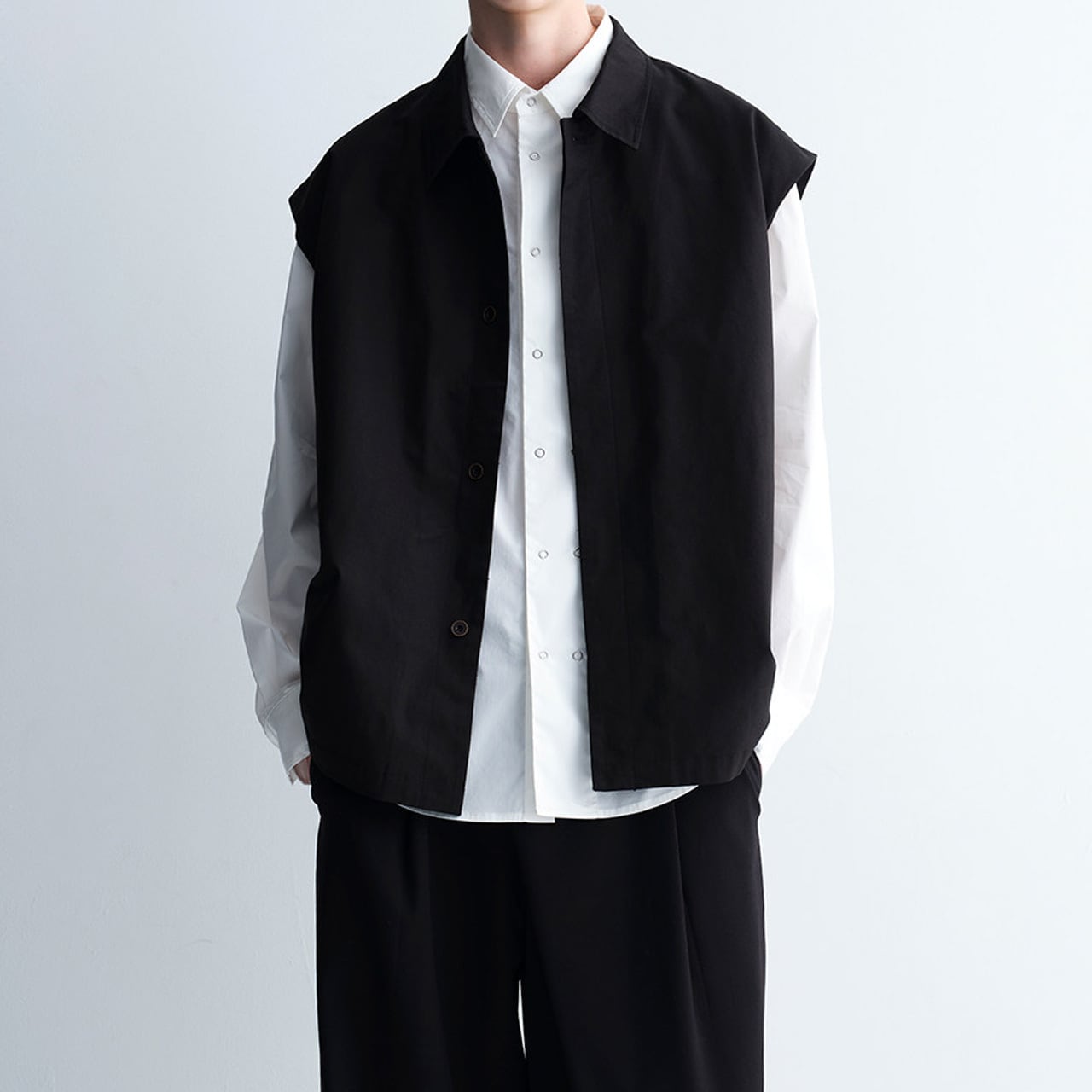 フロントのダブルスナップボタンが、ミニマルなデザインにさりげないアクセントを添える一着。