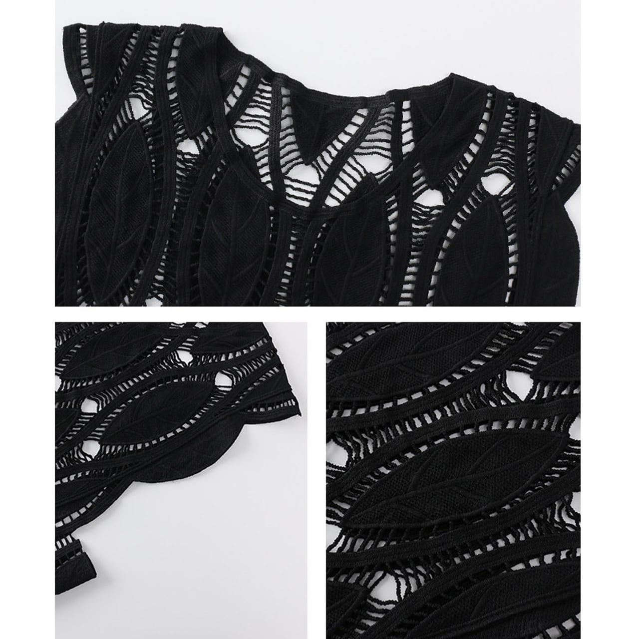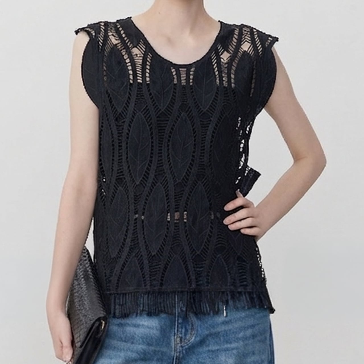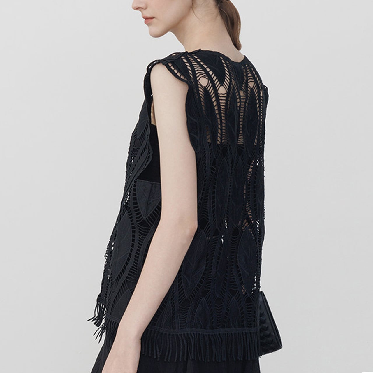 繊細な透かし編みと立体感のあるリーフモチーフが目を惹く、存在感のあるノースリーブトップス。 程よくゆとりのあるシルエットが魅力で、インナー次第でさまざまなレイヤードが楽しめる一着。 ■Size(cm) S:胸囲100, 着丈65 M:胸囲104, 着丈66 L:胸囲108, 着丈67 *1-3cmの誤差が生じる場合がございます。 ■Material Polyester:100% ■Color Black ■お届けについて ・通常1〜2週間前後でお届けいたします。 ・商品により3週間以上かかる場合もあります。 ・一点ずつ丁寧に検品を行い、発送いたします。 ■Easy care シワになりにくく、デイリーユースな一着。 ・手洗いまたは洗濯ネットをご使用ください。 ・漂白剤 / 浸け置き / タンブラー乾燥不可。 ・直射日光を避け、日陰で吊り干ししてください。 ・アイロンは当て布をし、低温でご使用ください。 ・繊細な素材のため、引っかけにご注意ください。 ■注意事項 ・万が一在庫切れとなった際は、速やかにご連絡の上 全額返金の手続きをさせていただきます。 ・厳格な基準に基づき検品を行っておりますが、微細な傷や汚れがある場合はご容赦ください。 ・光の当たり方やモニター環境により、実物と色合いが異なる場合がございます。 ・イメージ違いやサイズ相違等、お客様のご都合による返品・交換・キャンセルは承っておりません。 上記をご理解の上、お買い物をお楽しみください。 ———————————— ■ご購入前にこちらをお読みください →https://official.uaenstudio.com/about ■TOP →https://official.uaenstudio.com