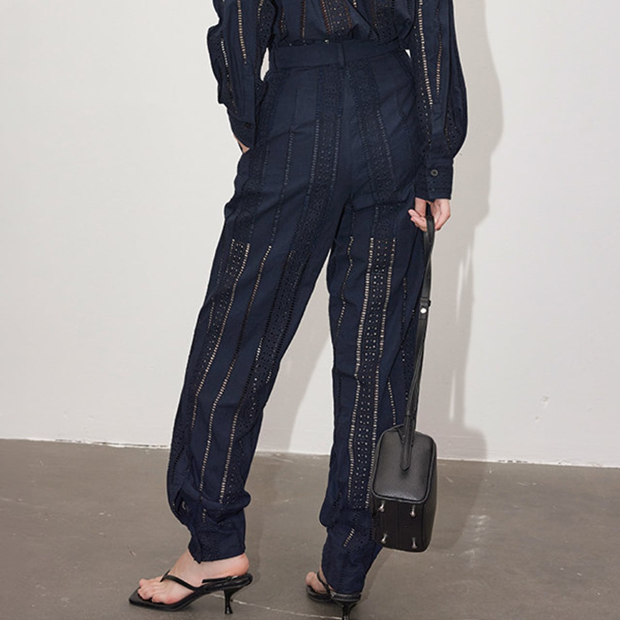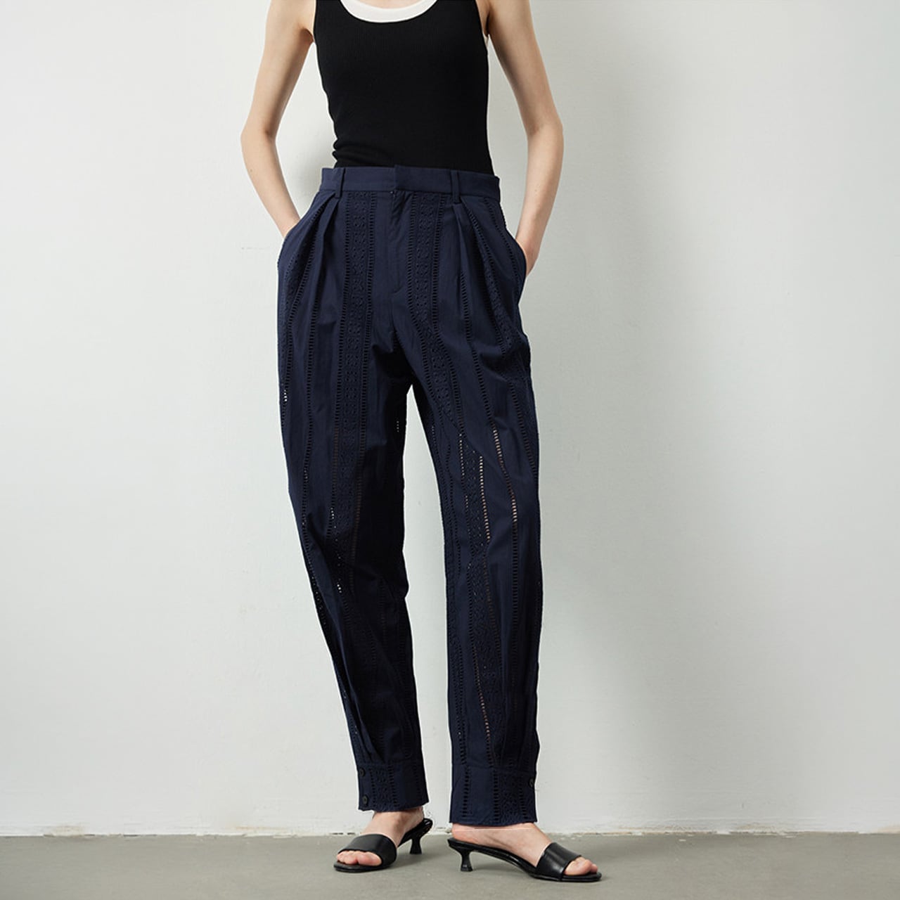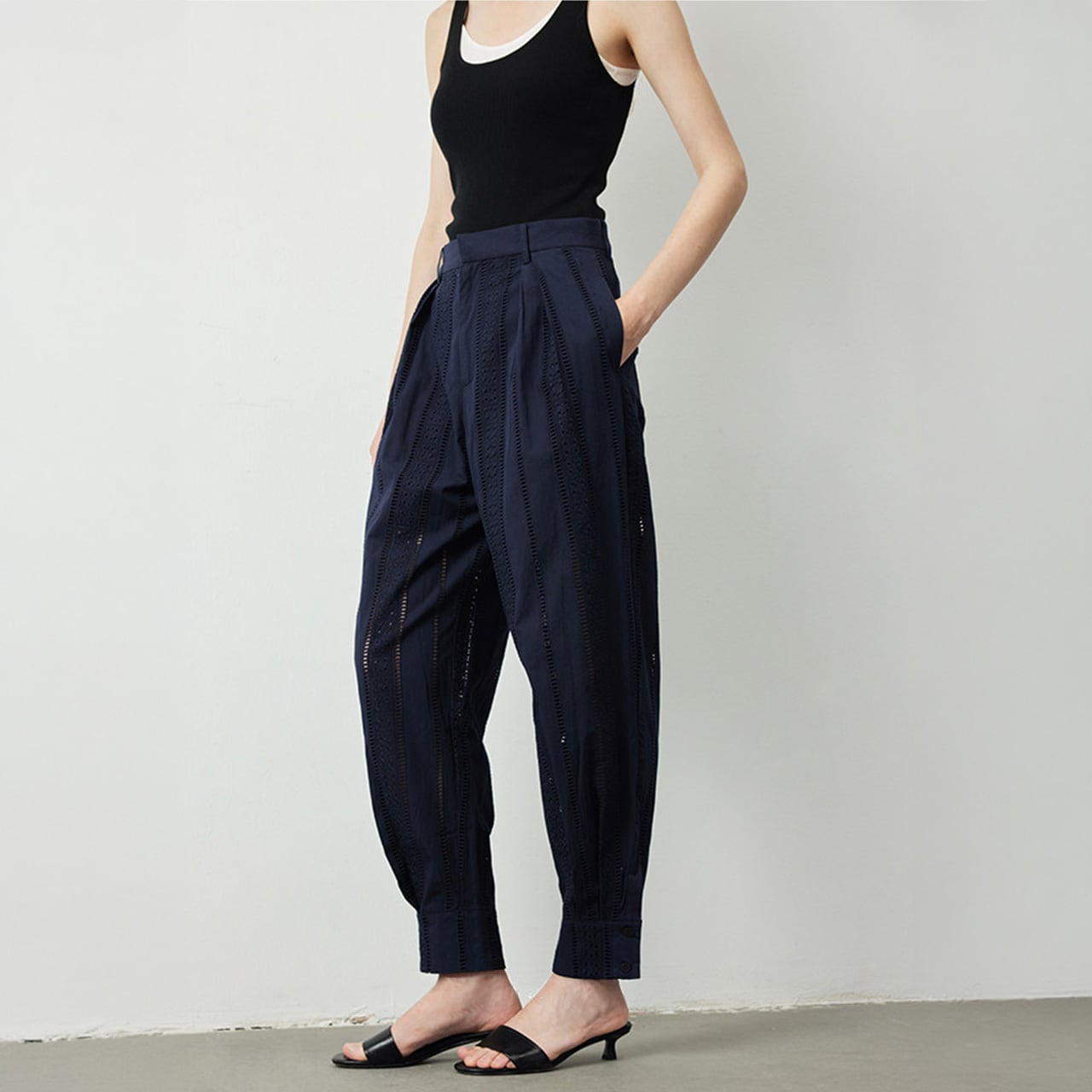 裾に向かって曲線を描く樽型のシルエットと、幾何学的なアイレット刺繍を施したバレルパンツ。