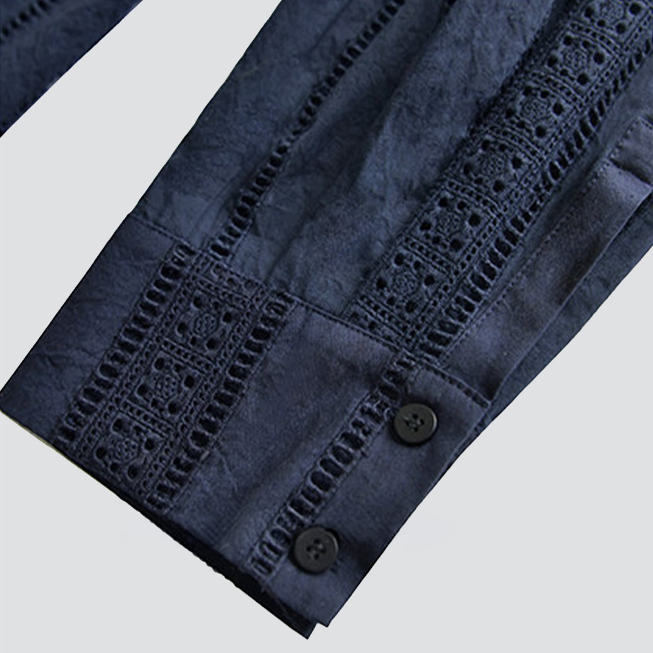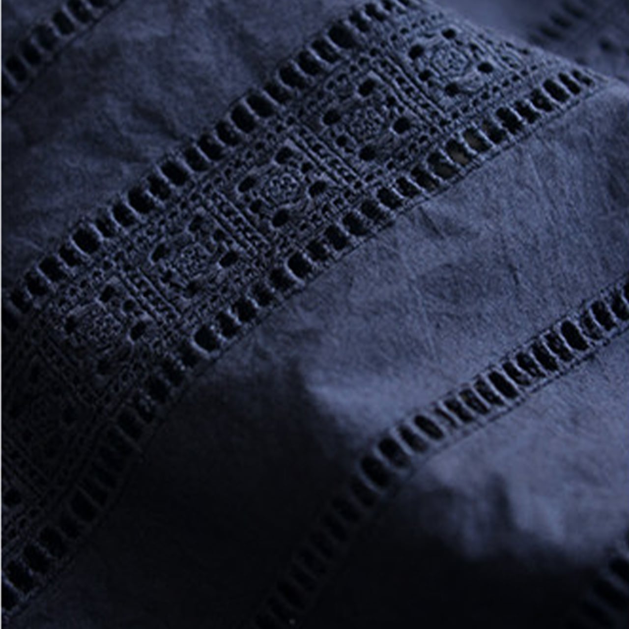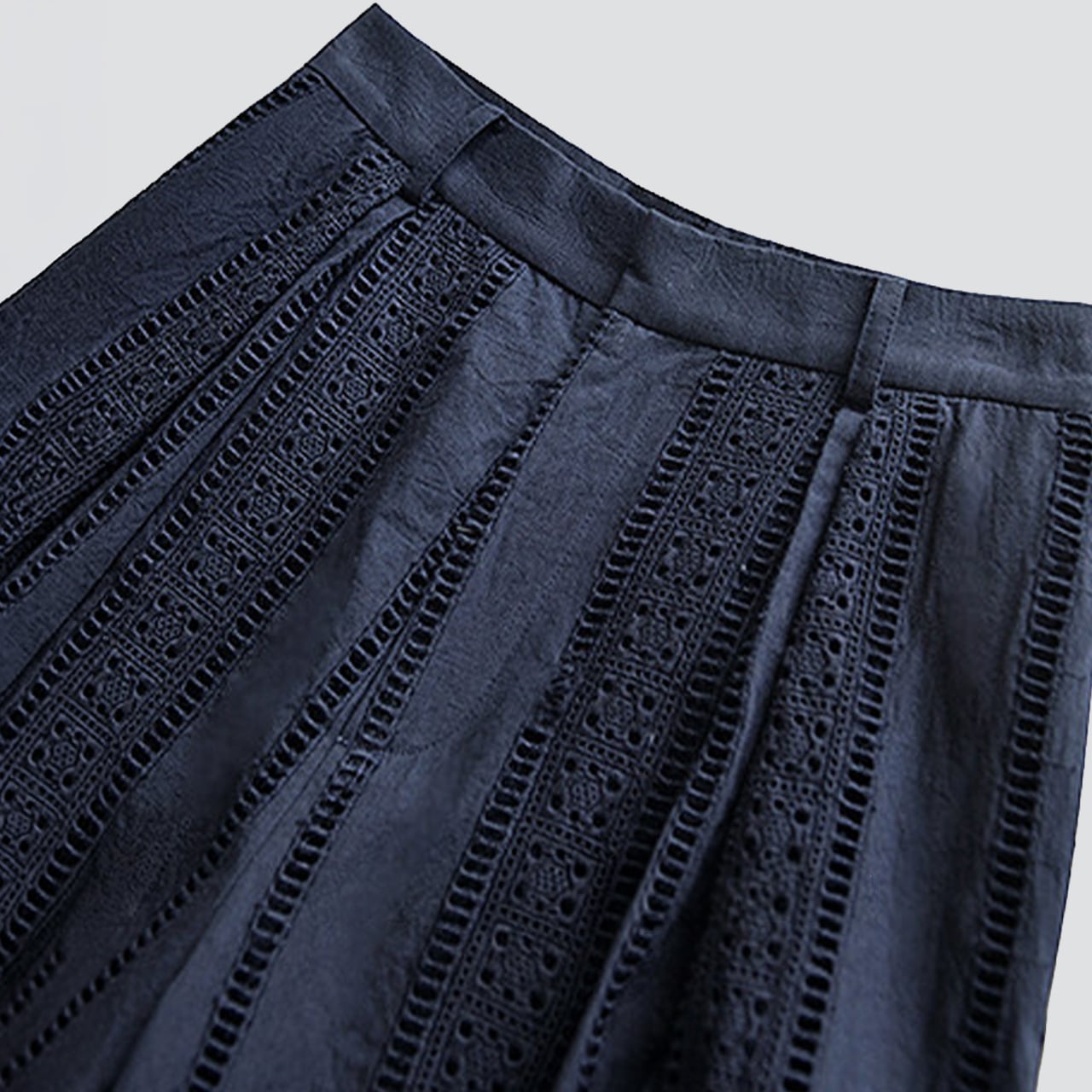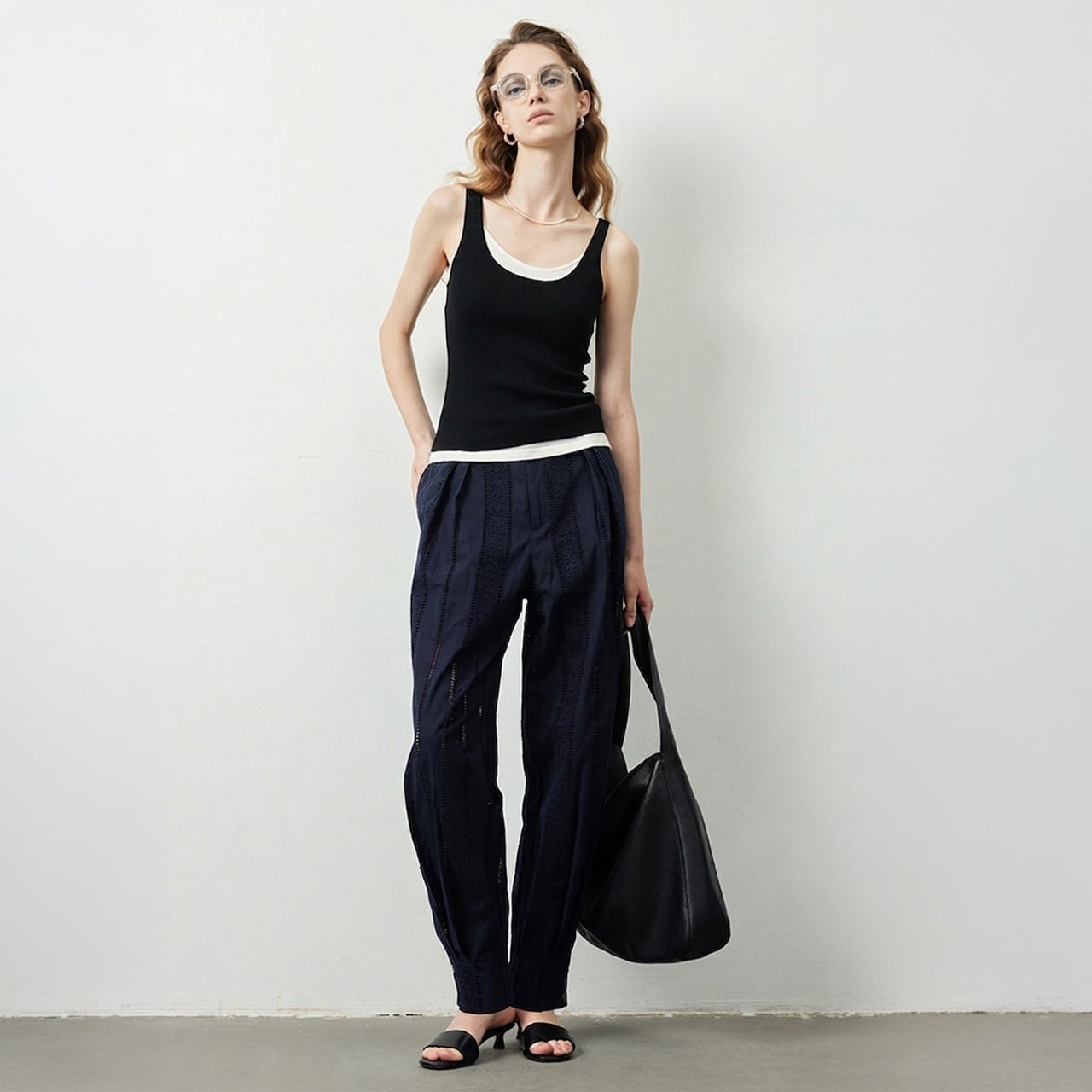 裾に向かって曲線を描く樽型のシルエットと、幾何学的なアイレット刺繍を施したバレルパンツ。
